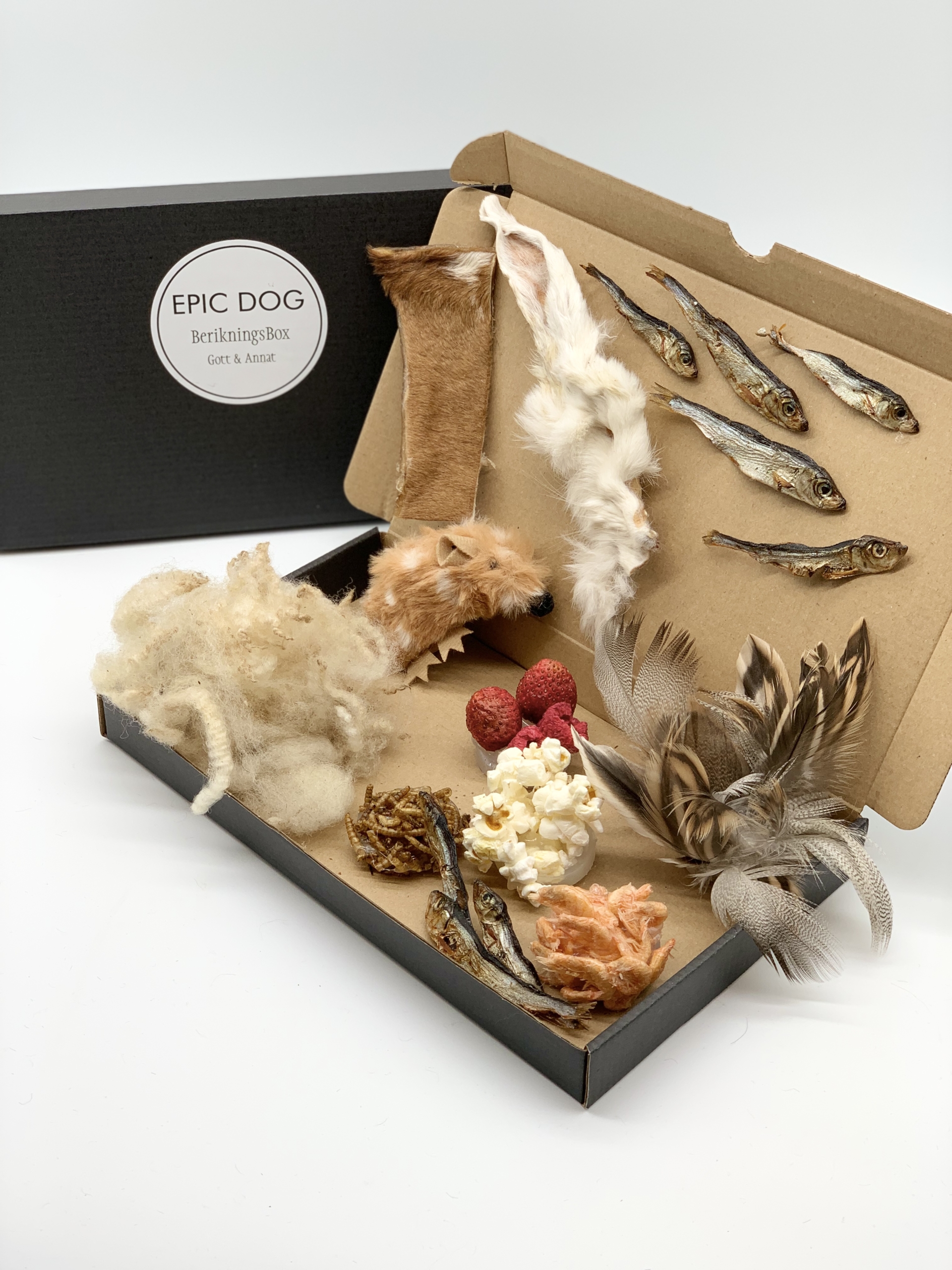 Kaninöra, Nöthud, Torkade fiskar, Frystorkade räkor, Torkade mjölmaskar, Frystorkade bär, Probiotika popcorn, Dunfjädrar från vildand, Fårull, Pipande mus (med batteri)